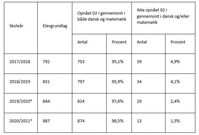 Tabellen viser, hvor mange elever fra almenområdet, der de sidste fire skoleår henholdsvis opnåede og ikke opnåede karakteren 02 i gennemsnit i dansk og/eller matematik ved afgangsprøven i 9. klasse: