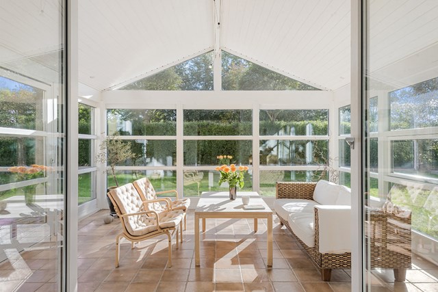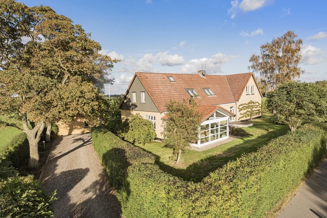 Huset på Hvalsøvej er fra 1910, og det var oprindeligt en skole med liv og glade dage i den flotte gildesal eller balsal om man vil. Det blev ombygget i 1992, og det er meget velholdt hus på 287 m2, altså masser af plads med masser af lys, masser af Danish hygge og masser af udsigt til åbne marker, Vor Herres frie natur og en skøn, gammelbeplantet have på den 3324 m2 store grund.