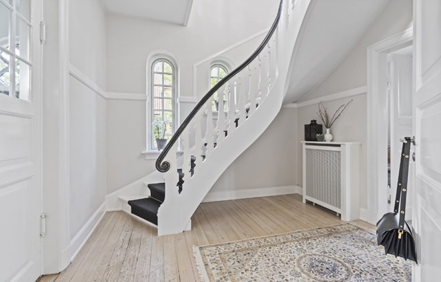 Med den klassiske, røde mursten, med sprossevinduer og zinkbeklædt pavillon, med stuk, rosetter, træudskæringer, tunge fyldningsdøre, rundbueåbninger i døre og vinduer, ja, med hvad et æstetisk og fængeligt hjerte dog kan begære, er alt det danske håndværk repræsenteret her på Dronning Margrethes Vej 35. En royal vej, nemlig, i et royalt kvarter. Sådan skal det være.