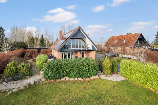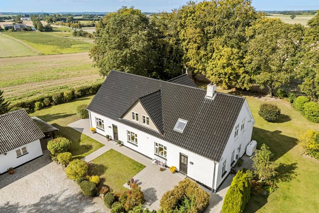 Ejendommen ligger højt i terrænet, udsigten ud over det sjællandske landskab er derfor mageløs. En stor dobbeltgarage med værksted hører med til ejendommen - det skal der være på landet.