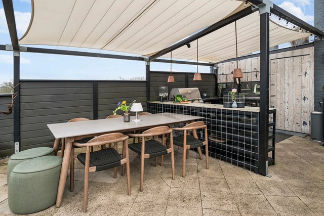 Drømmer du om at bo i Roskilde med privat tagterrasse og fantastisk udsigt? På Hyrdehøj Stræde 25 ligger et rækkehus, der byder på en enestående boligoplevelse. Dette smukke hjem, bygget i 2002, har en moderne stil med store vinduer fra gulv til loft og privat tagterrasser med udendørs køkken og bålplads.